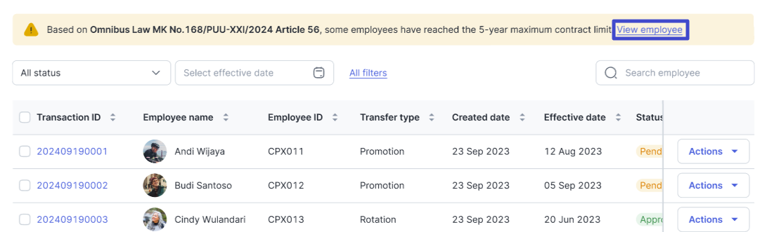 Case example: There are PKWT contract employees whose work period has exceeded 5 years. Complying with government regulations regarding the Omnibus Law, you can change employee settings by utilizing this mass employee transfer feature. If there are employees with these criteria, Mekari Talenta displays a notification like the following on the Dashboard.