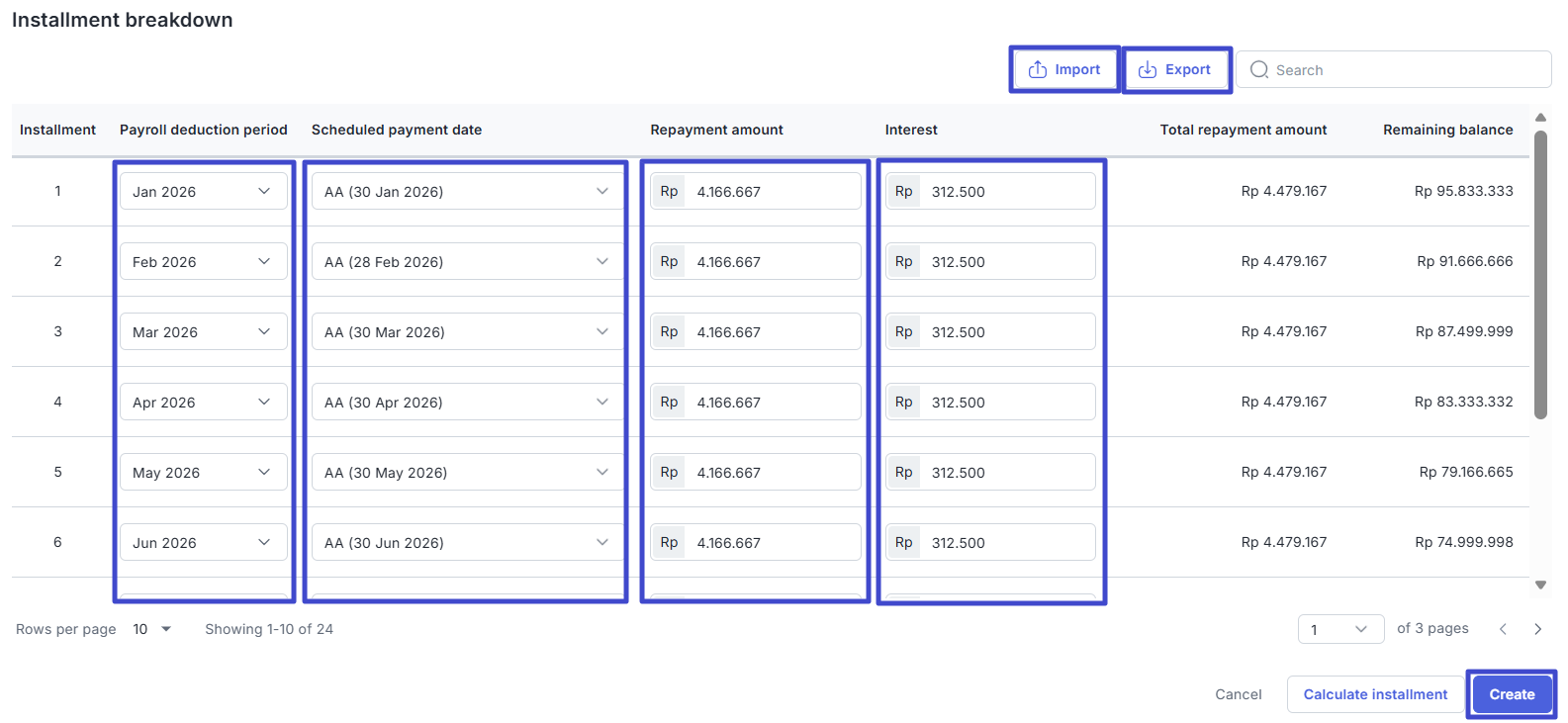 - Import: Click to upload the Installment Breakdown Excel file if you make any changes after downloading.