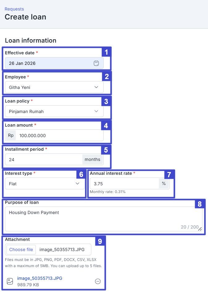 No. Column Name Description 1. Effective date Enter the effective loan start date. For example, '26 Jan 2026'. 2. Employee Select the employee's name. For example, 'Githa Yeni'. 3. Loan policy Select a loan policy . For example, 'Home Loan'. Learn how to create a loan policy by clicking here. 4. Loan amount Enter the loan amount. For example, Rp '100,000,000' (type without the period, as it will appear automatically). 5. Installment period Determine the length of the installment period (per month). For example, '24'. 6. Interest type Select the interest rate type. For example, 'Flat'. You can choose other options such as Declining or Non-interest. 7. Annual interest rate Enter the loan's annual interest rate. For example, '3.75' percent (%). 8. Purpose of loan Fill in this field with a description of the loan purpose (optional) . For example, 'Housing Down Payment'. 9. Choose file Click to include file attachments in JPG, PDF, PNG, DOCX, CSV, and XLSX formats with a maximum size of 5MB (optional). Once the form is filled in, go to the bottom of the page and click “Calculate installment”.