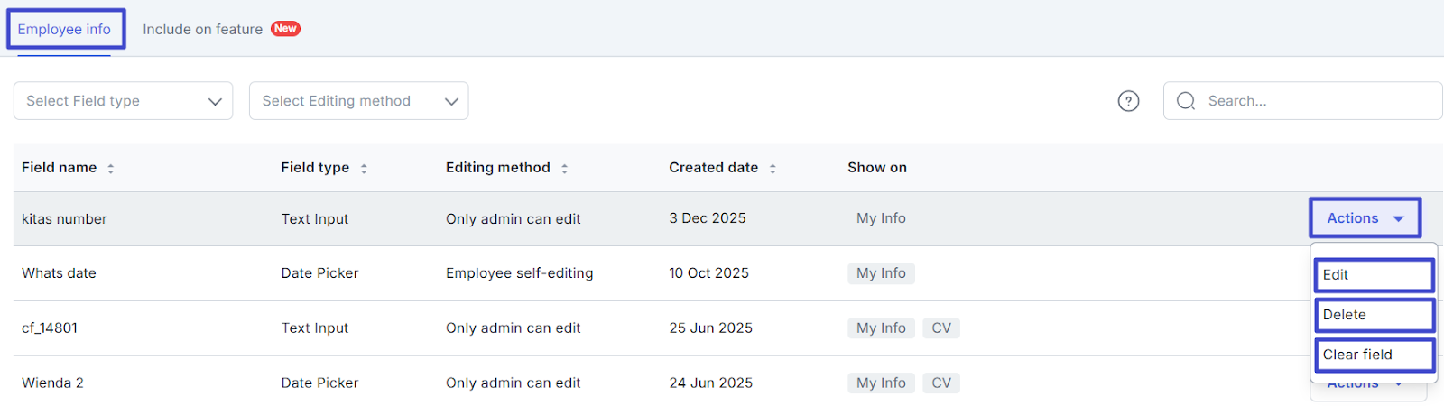 Still on the Custom Fields page on the Employee Info tab, you can take actions on the Employee fields you've created in the list. For any of the fields you've created, click "Actions". You'll see several action options, as shown below.