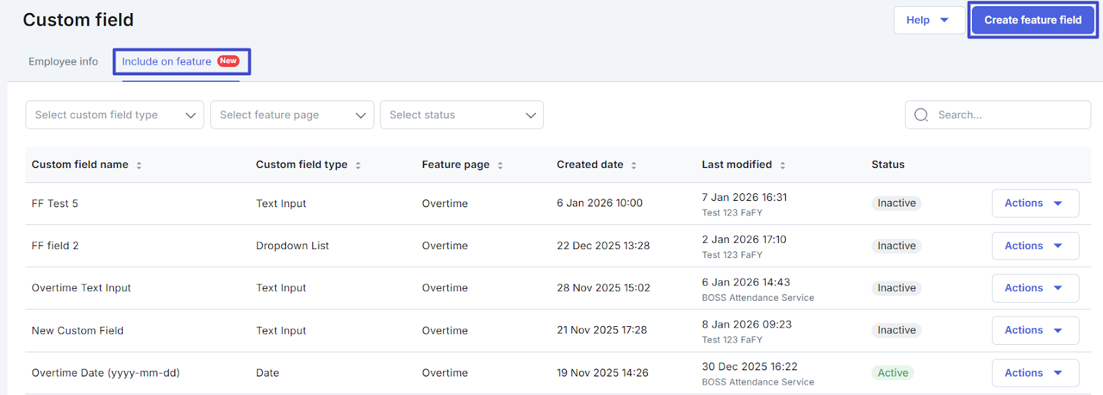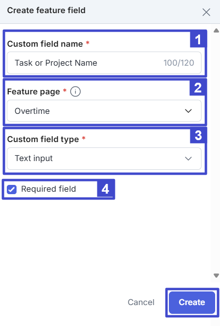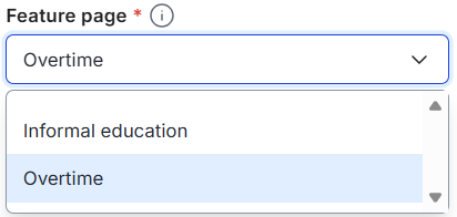 | 2 | Feature page | Select where this field will be displayed, such as Informal education or Overtime . |