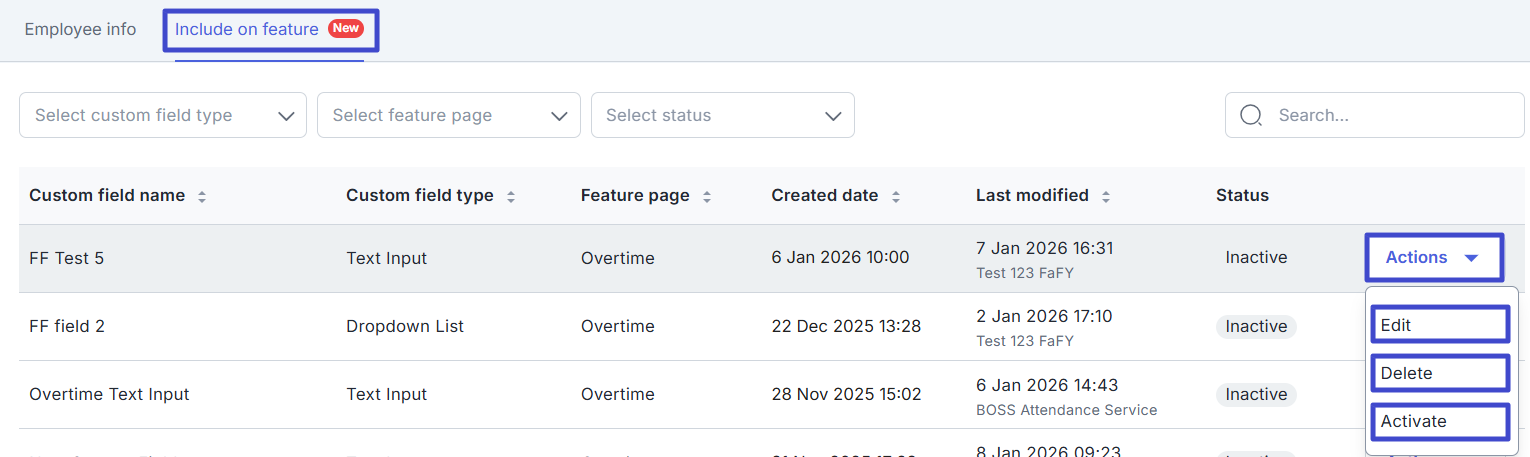 Still on the Include on feature tab page, you can take action on the feature fields you have created by clicking "Actions" on one of the fields you have created.