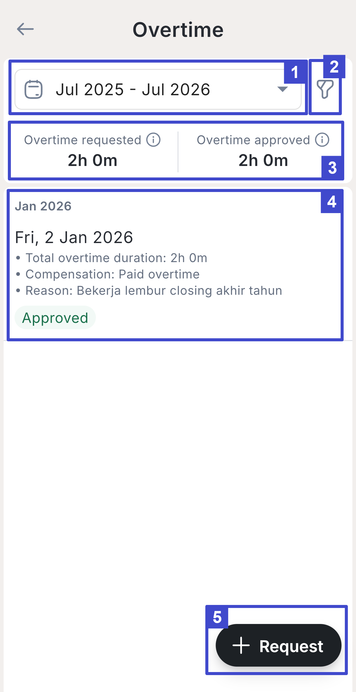 No. Display Description 1. Period Filter Filter by the desired month, so the information will be displayed for the cut-off period in that month. 2. Filter View the overtime list based on other filters, such as status (Pending, Approved, Rejected, Canceled). 3. Overtime Request Summary The section displaying a summary of overtime requests that have been submitted and approved. 4. Detail Click to view the details of the submitted overtime. 5. Request Overtime Button to request overtime. Click on “Detail” to see the overtime details display as follows, where you can see the details in the Request detail tab.