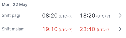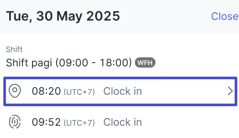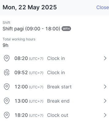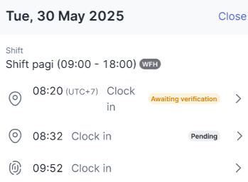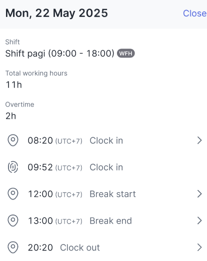 If the selected date has multiple shifts, the attendance and overtime data will be separated based on the shift so users can review them one by one as follows.