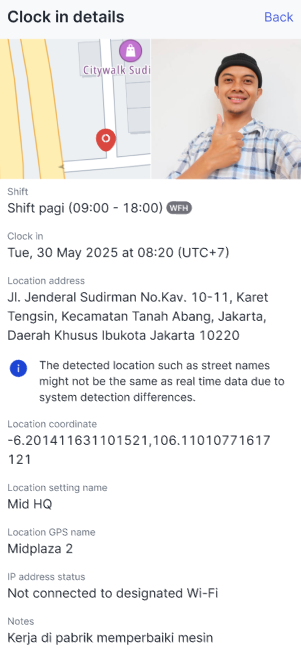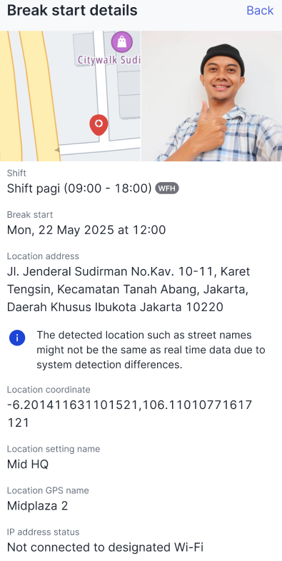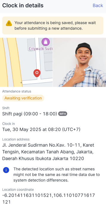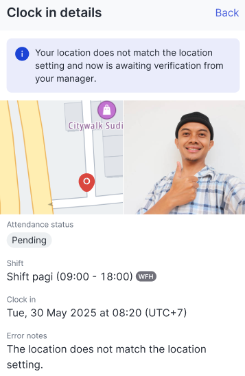 And here are the details with a Pending status with a blue notification for your attention.Attendance details with a Break.