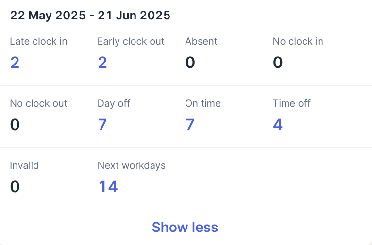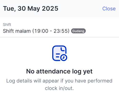 1. Period Filter Click to set the Attendance log period filter. 2. Attendance Log Summary You can see a summary of your attendance based on the period you have selected here. If you tap on the blue numbers, you will be directed to more detailed information as follows.