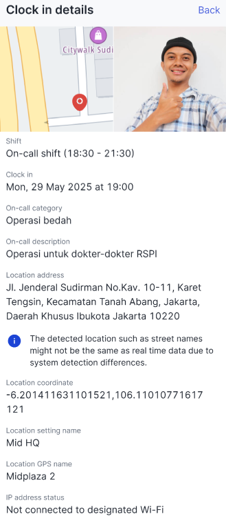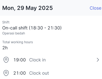 Attendance details with an On-call shift.