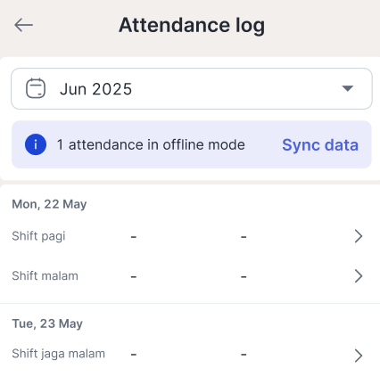If the company activates the “Live Attendance” feature with offline mode when not connected to the internet, the attendance log will only display offline attendance data available on the local device storage. When the device is connected to the internet, the offline data will be synced to Talenta, or click "Sync data" to synchronize.