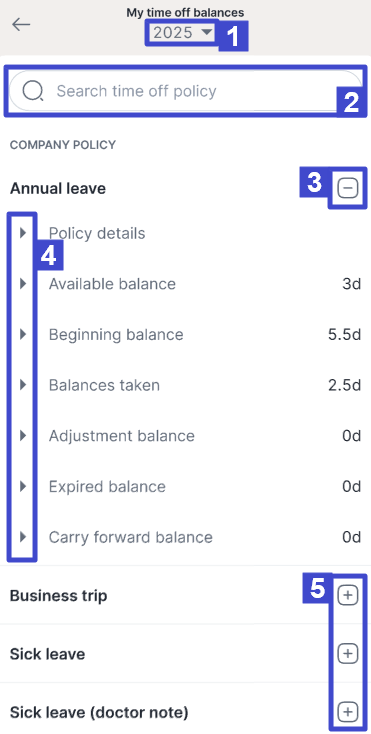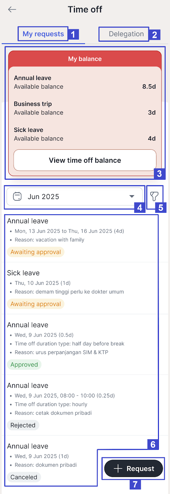 | 1. | My requests | List of submitted leave requests. |