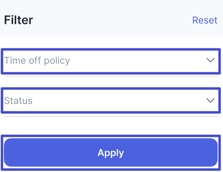 | 5. | Filter | Click to view the leave list based on the filter Time of policy or Status. After selecting the filter options based on both categories and saving them, click “Apply” to apply the filter to the leave list. You can click “Reset” to clear the filter options, then click “Apply”. |