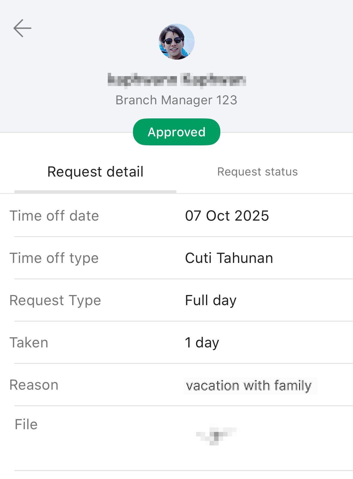 This is a list of your requested leave. You can click on it to view detailed leave information, which will take you to a page like the one below. If the leave application status is still Awaiting approval , you can click the "Cancel request" button to cancel the leave application. |