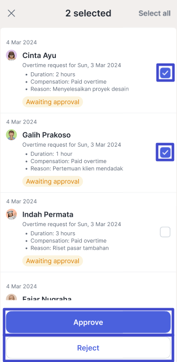 Click to check multiple requests with the status “Awaiting approval” so you can take mass actions approve/reject. Then, click “Approve” to accept and “Reject” to decline the request. Click “Select all” if you want to check the entire list to approve or reject requests in bulk. Important