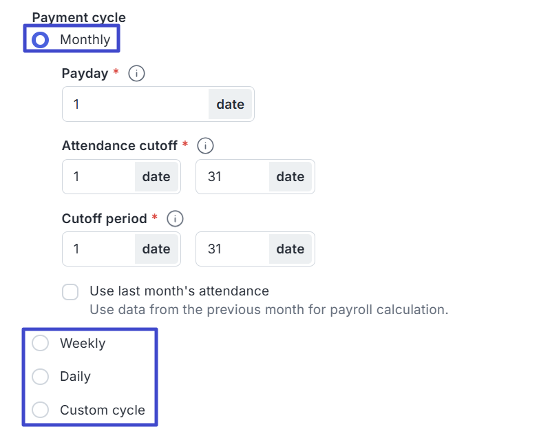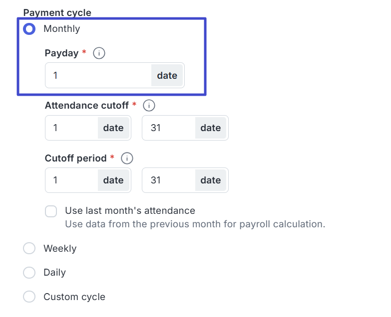 If you select the Monthly payment cycle, you will also need to specify the date on which salaries will be paid each month.