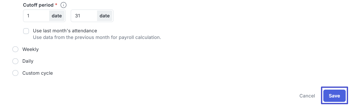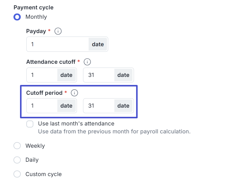 Enter the attendance date limit in the Attendance cutoff field. This affects the calculation of daily-based components, such as overtime, late deductions, and meal allowances.