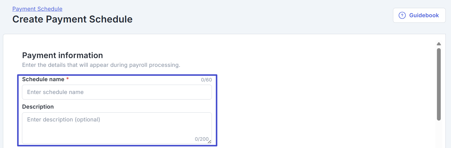 Enter the payment schedule name in the Schedule name field, and add a description if necessary.