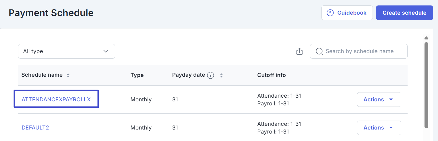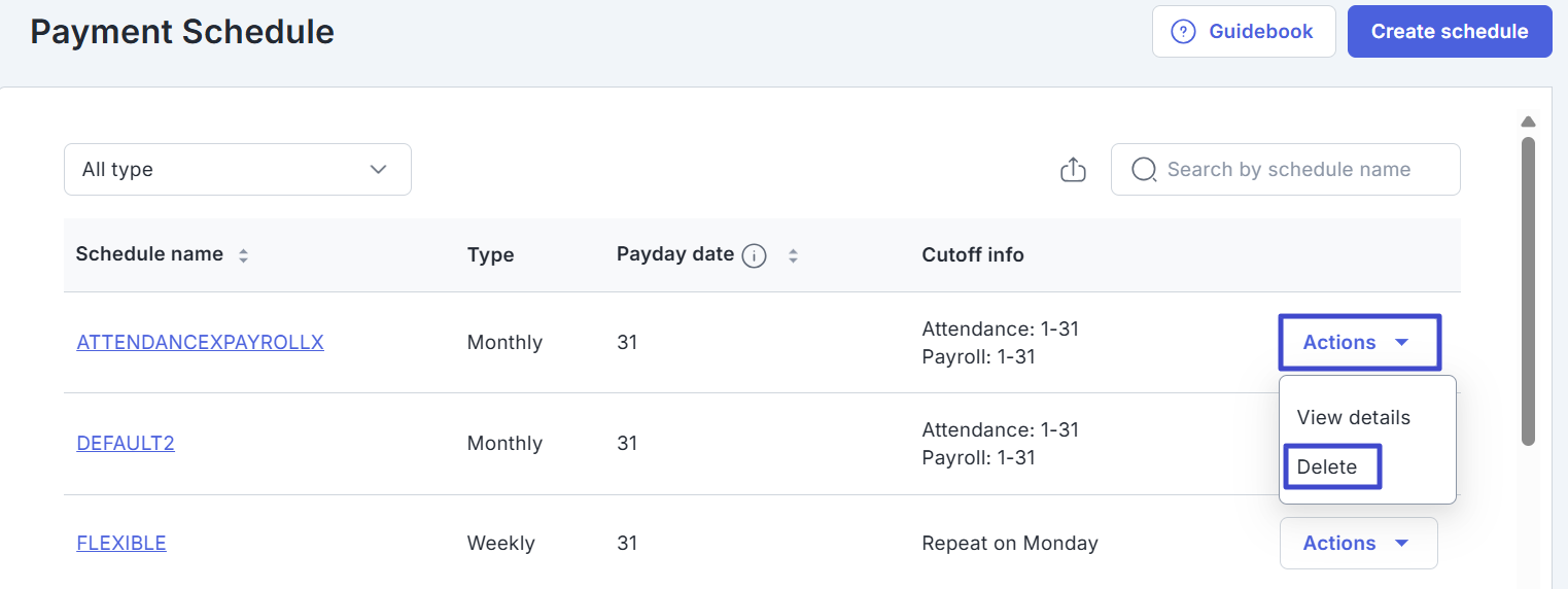 If the payment schedule is no longer used, you can delete it by clicking “Actions” and selecting Delete.