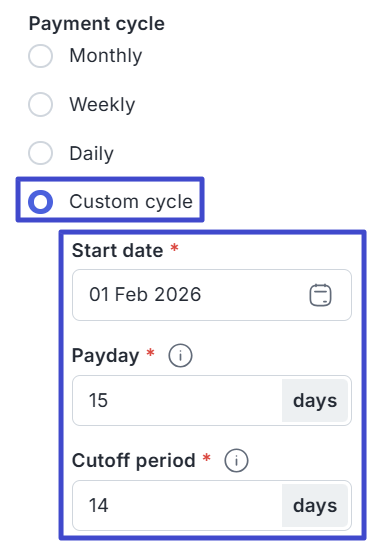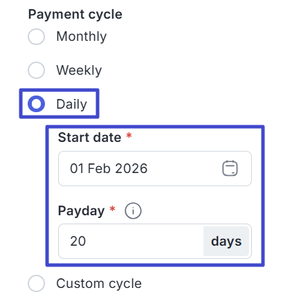 In the Payment cycle section, choose whether payments will be made Monthly, Weekly, Daily, or Custom.