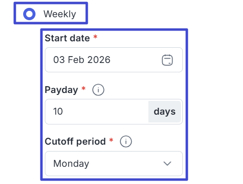 If you select Weekly, you will be required to enter the weekly payment schedule start date in the Start Date field, the payroll payment date, and the cutoff day in the Cutoff period field.