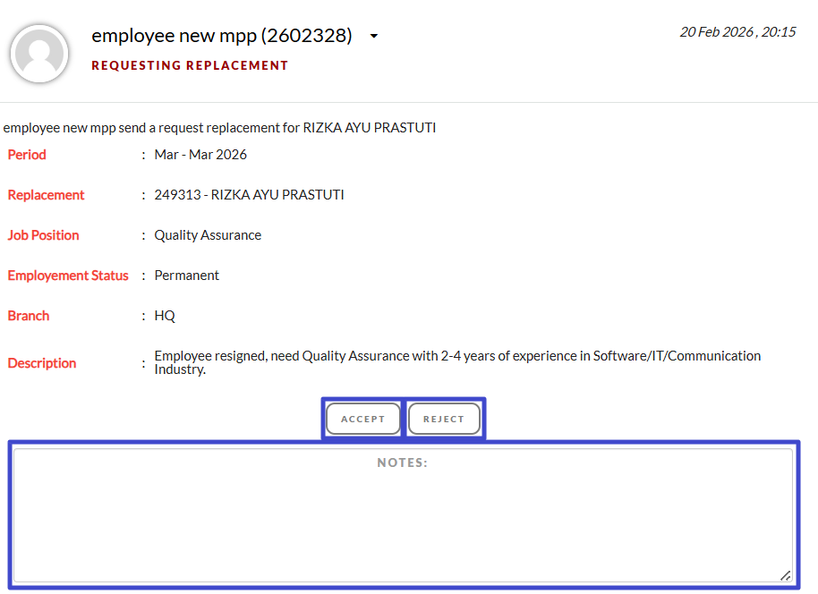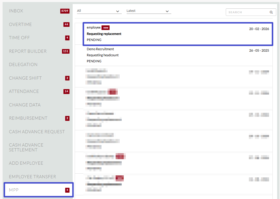 Click the “MPP” tab in the list menu on the left, then select the incoming approval request message, whether it is headcount or replacement.