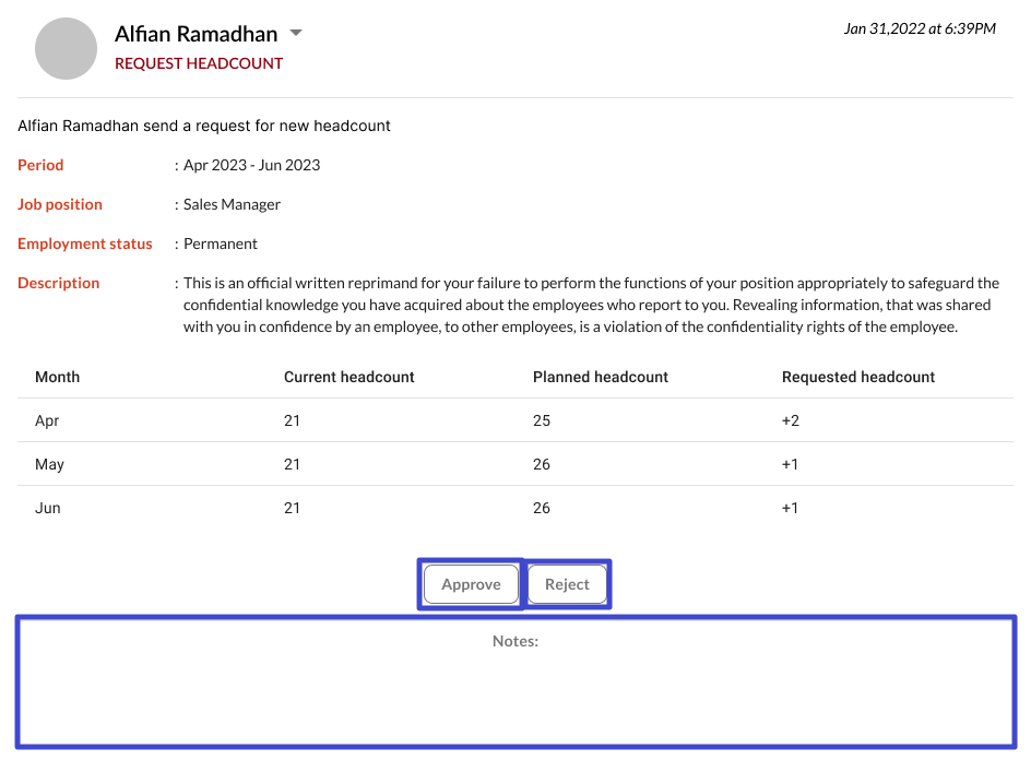 Then, click “Approve” to approve the submitted request or “Reject” to reject it. In addition, you can add a note in the Notes column.