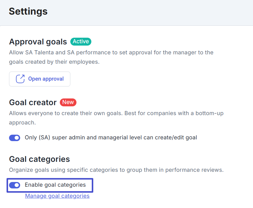 Slide the toggle Enable goal categories to activate the goal categories feature so that Super Admin and HR can access the management menu from the Goal Settings page and arrange the framework before applying it to the company.