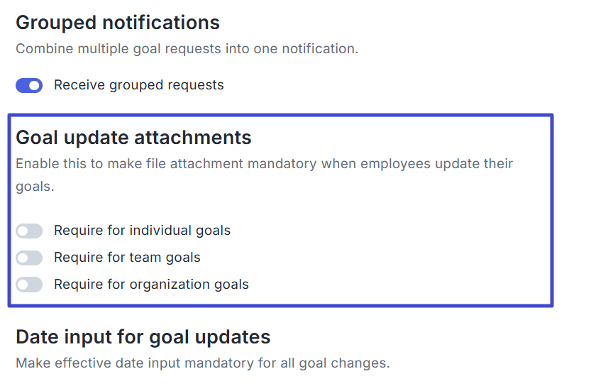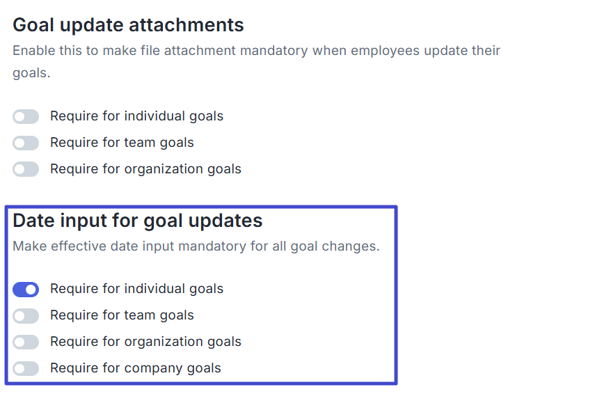 - Finally, in the Date input for goal updates section, you can slide the toggle for Individual, Team, Organization, and/or Company (goal categories) if you want to enforce mandatory effective date entry for goals.