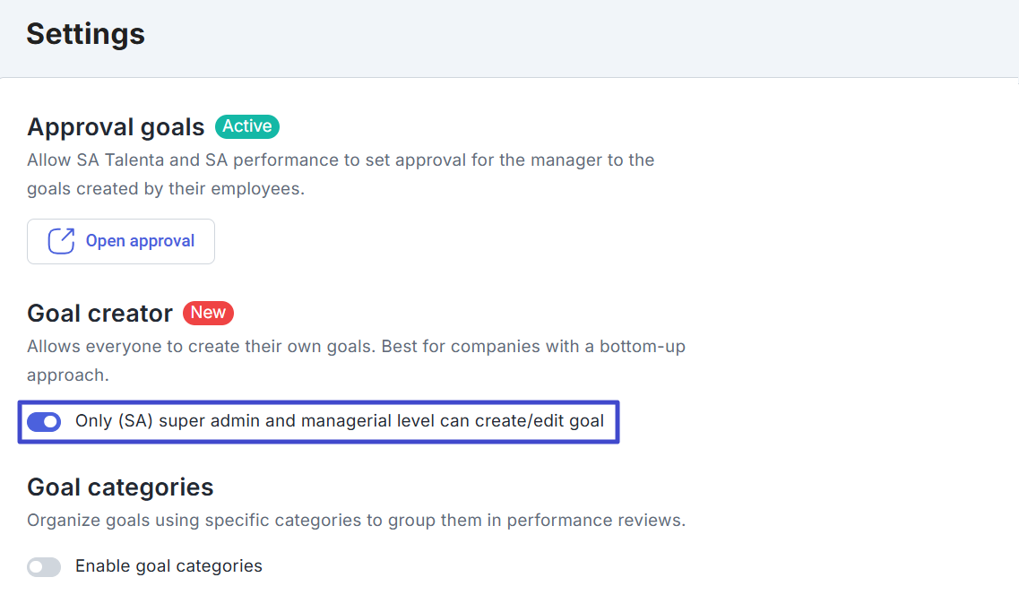- Check the toggle Only (SA) super admin and managerial level can create/edit goal if only the super admin role and managerial level can create or edit goals.