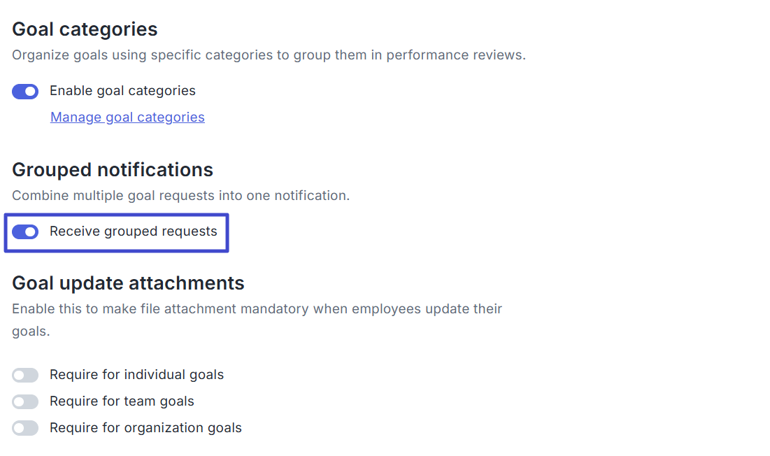 - Next, in the Goal update attachment section, you can slide the toggle for Individual, Team, and/or Organization (goal categories) if you want to enforce mandatory goal attachments.