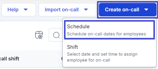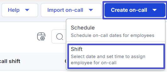 To directly assign a shift (with specific date and time) to an employee, on the On-call schedule page, click “Create on-call” then Shift.