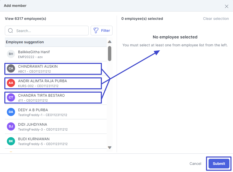 If you select Selected employee in the Select contributor column, you must select the names of the employees to be assigned as contributors in the following pop-up. Then, click "Submit".