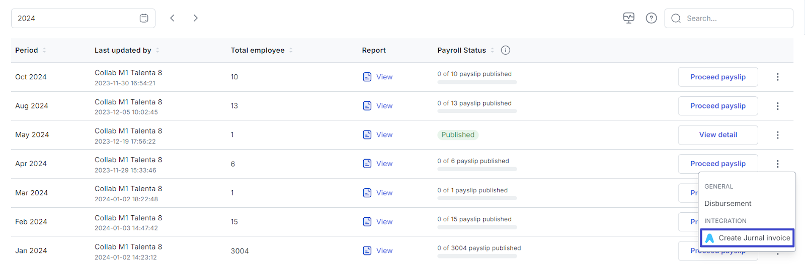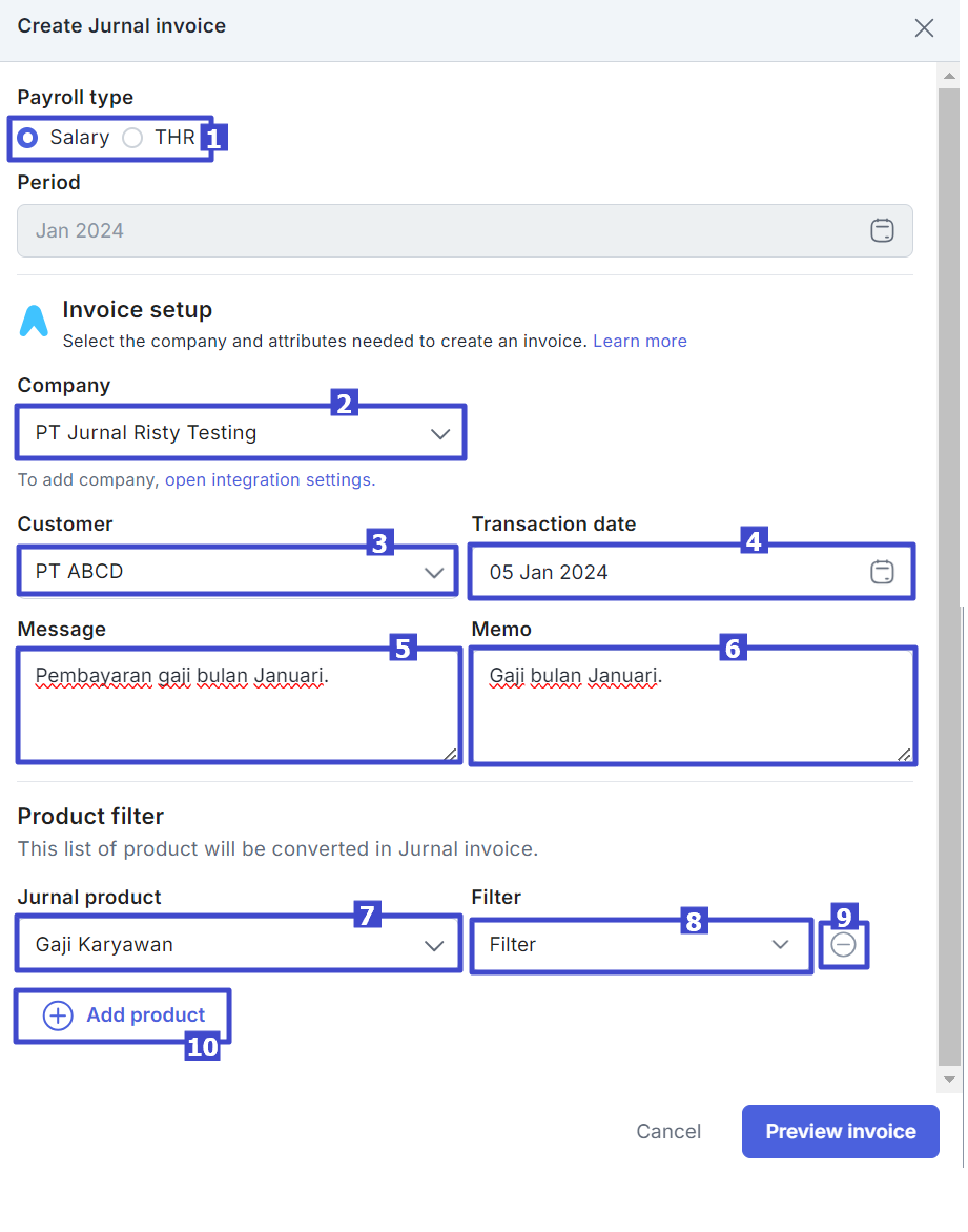 Information:No Column Explanation 1 Payroll type Select the payroll type you want. 2 Company Select the company for which the invoice will be created. The list of companies is a company that has been added to the Jurnal and Talenta Integration page.