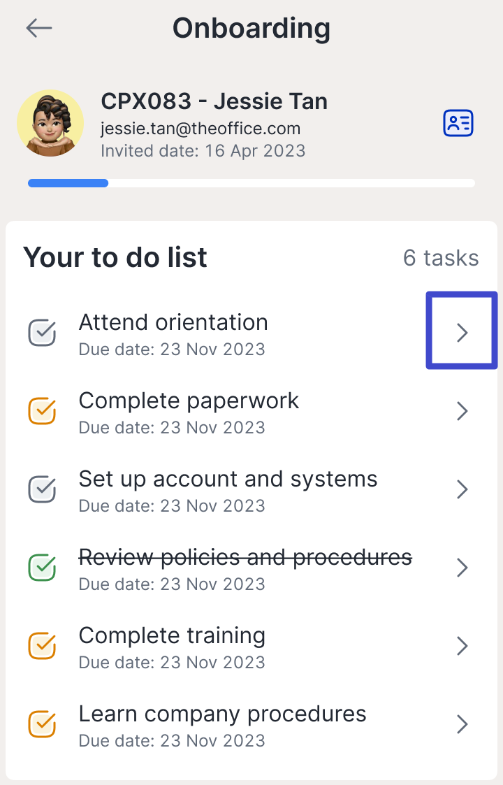 - On the Mobile Talenta Onboarding page, you can see the to-do list that HR has created for you. Click the “>” icon to see the details of the to-do list.