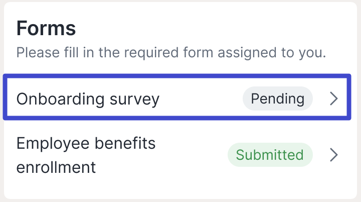 - In the next section, you can see a list of forms that you need to fill out. Click the “>” icon to open and complete the form.