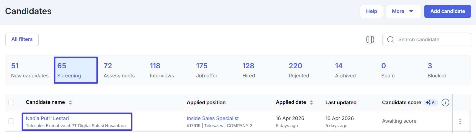 Click the “Screening” tab and then select a candidate’s name.