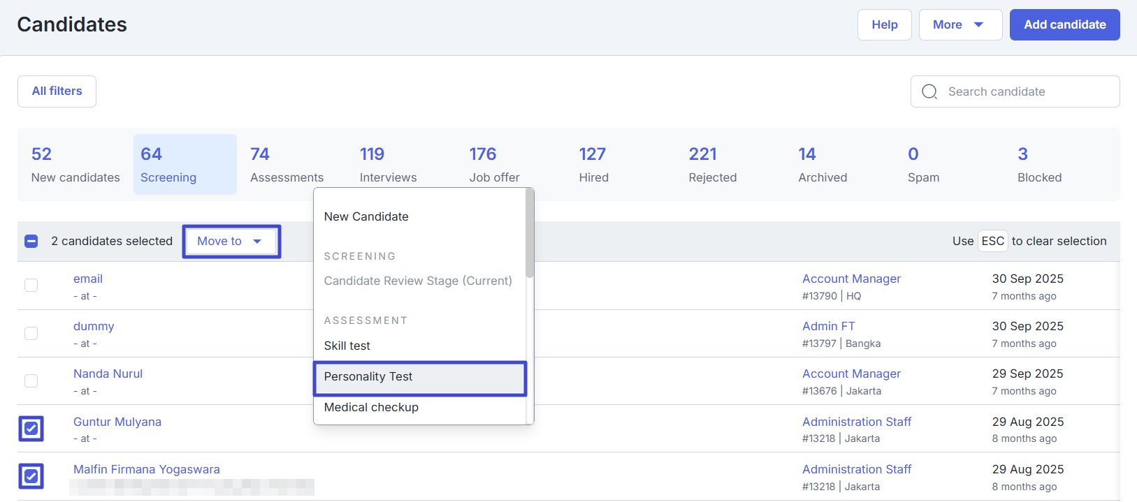 You can also invite candidates to take the assessment in bulk by checking the names of the candidates. Then, click “Move to”, and select one of the assessments you want to send. -