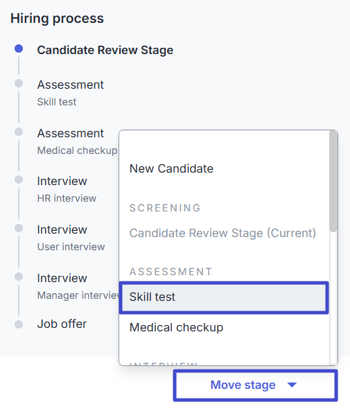 Then click “Move stage” and select one of the assessments you want to send under the Assessment section.