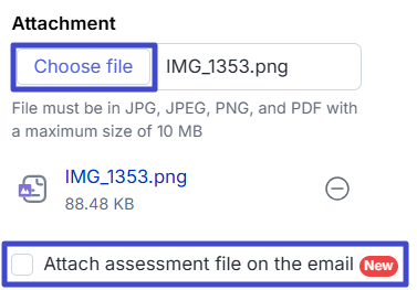 Next, if needed, click “Choose file” to upload attachments. After the attachment is successfully uploaded to the system, you can click “Attach assessment file on the email” to include the attachment in the email sent to the candidate.