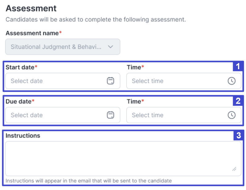 If you want the candidate to complete the Assessment Online, fill in the Due date and Time fields as shown below.