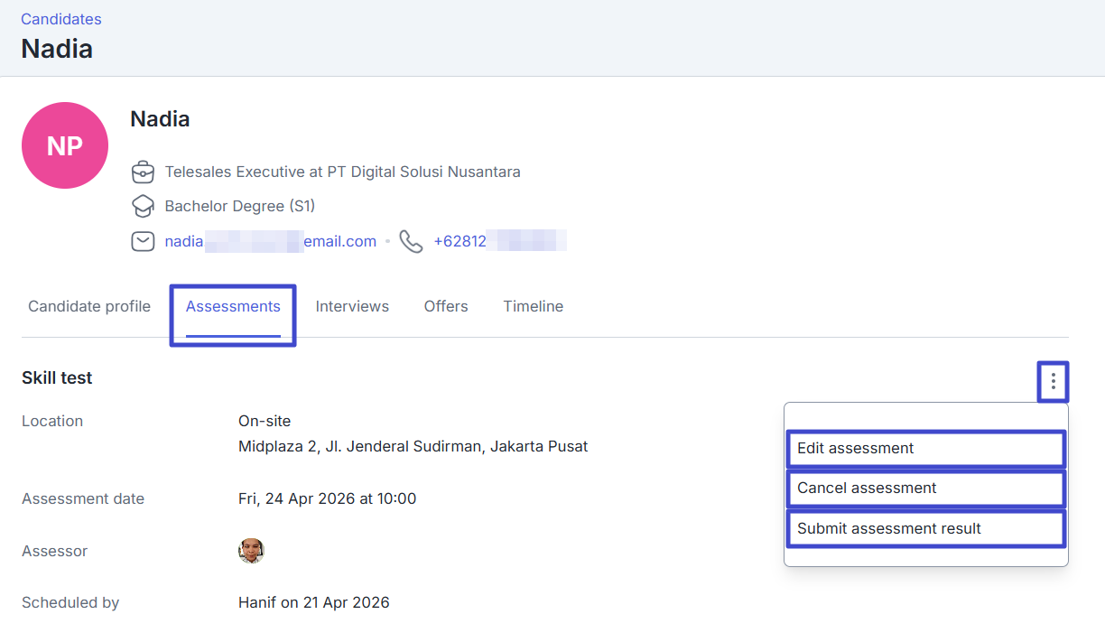 - Currently, the Cancel and Edit actions can only be applied to Assessments that do not contain tests.That concludes how to invite candidates for assessment. Next, you will learn about how to add an Interview schedule in New Talenta Recruitment.