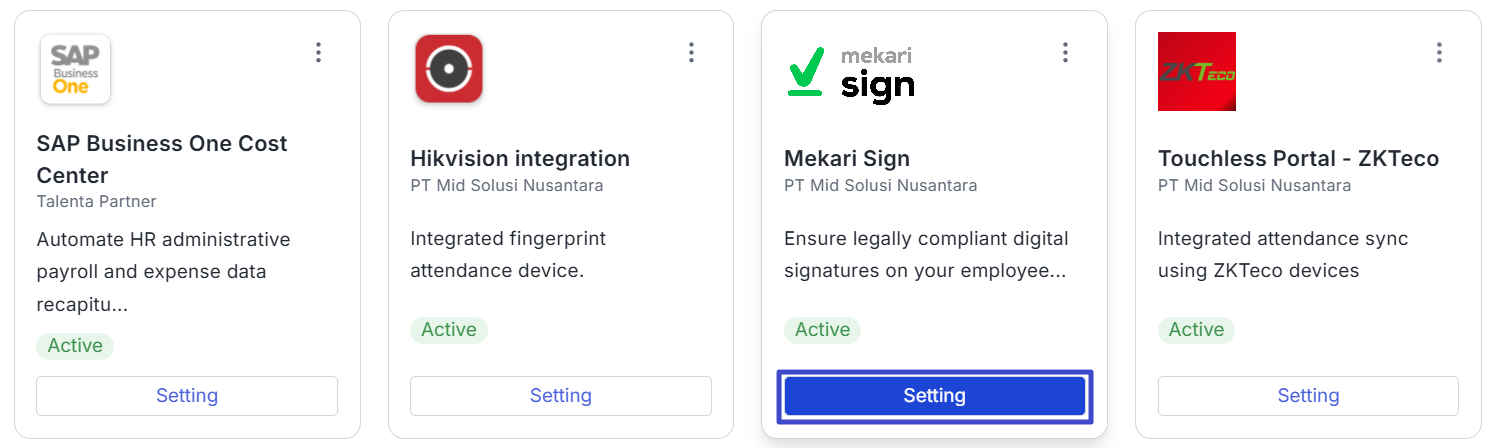 In addition, you can also decide on integration via the Integration menu, then click “Settings” in the Mekari Sign column.