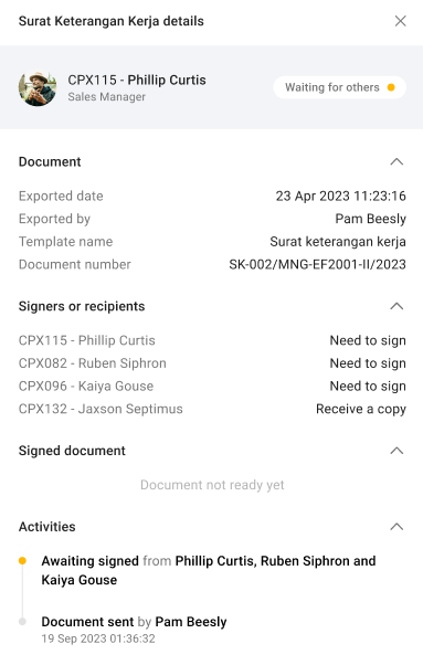 Here's an example of details for a document with the status "Waiting for others."