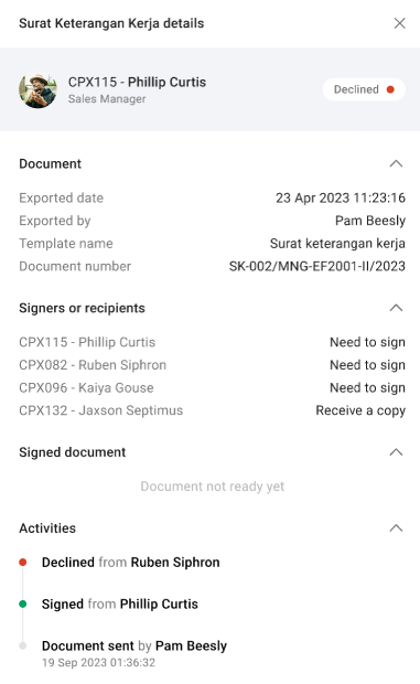 Here's an example of details for a document with the status "Declined."