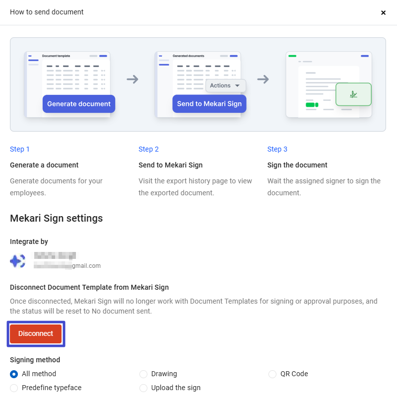 If the Mekari Talenta and Mekari Sign accounts have been successfully integrated, there will be a green banner that says “Connected”. If you want to disconnect the integration between the two applications, click "Settings and How it works."
