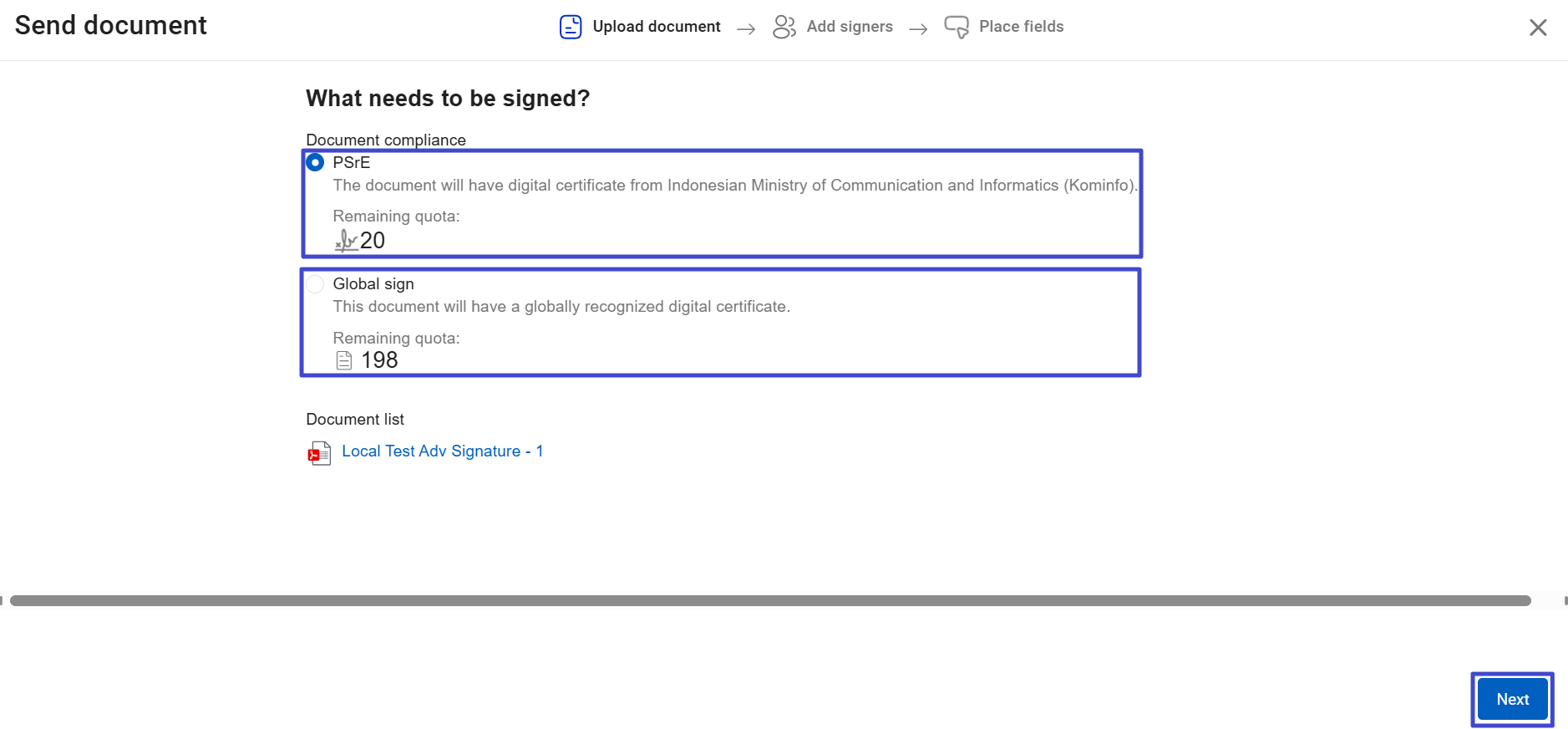 Select Document compliance PSrE if the document is local, for which Mekari Sign has received a digital certificate from the Ministry of Communication and Information Technology (KOMINFO). Alternatively, select Global Sign if the document is international, for which Mekari Sign has received a global certificate. Then, click "Next."