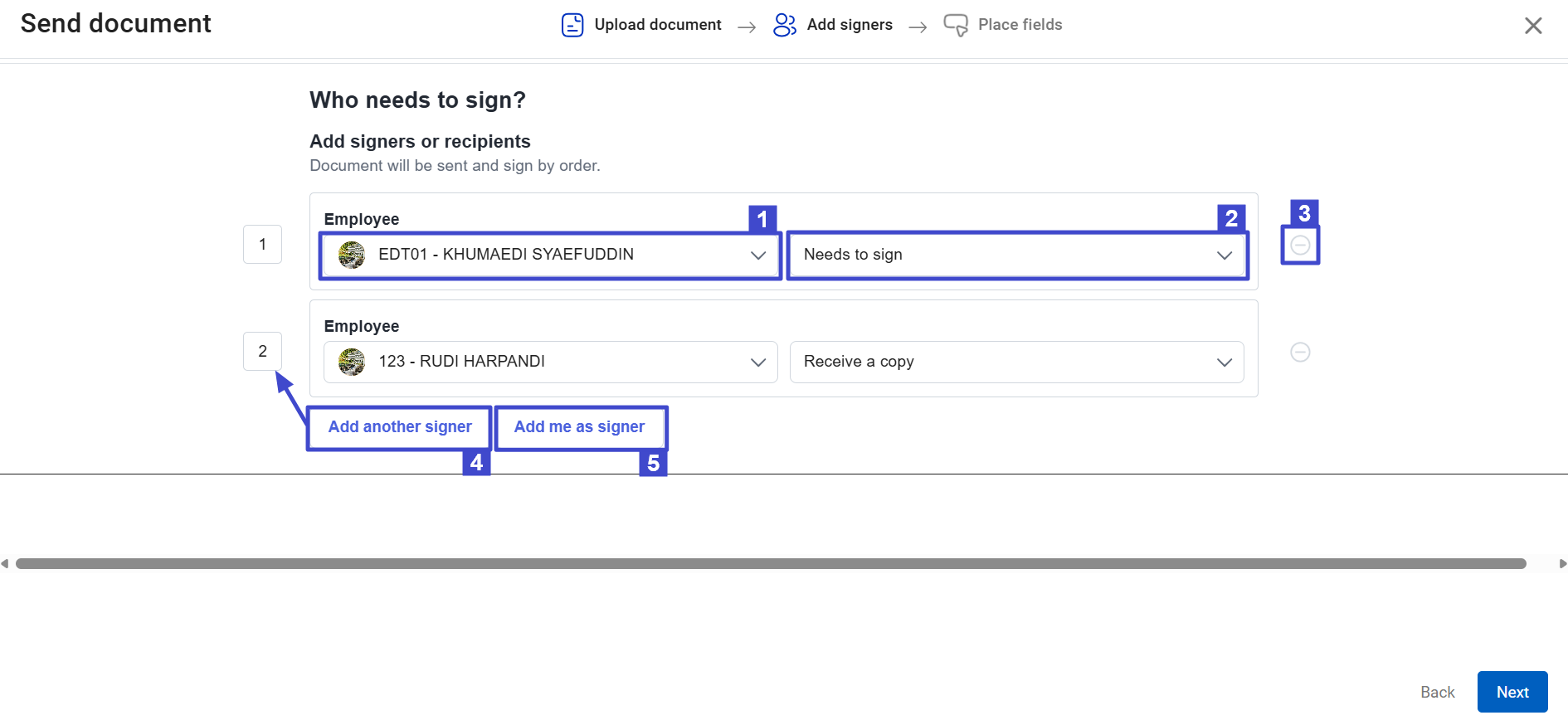 Select the purpose of sending the document to the employee; Needs to sign if the employee needs to sign this document, or Receive a copy if the employee needs to receive a copy of the document 3 Delete employee Click to delete an employee from the list. 4 Add another signer Click to add employees to the list. 5 Add me as signer Click to add yourself as an employee to the list. Click “Next” to proceed to the next page.