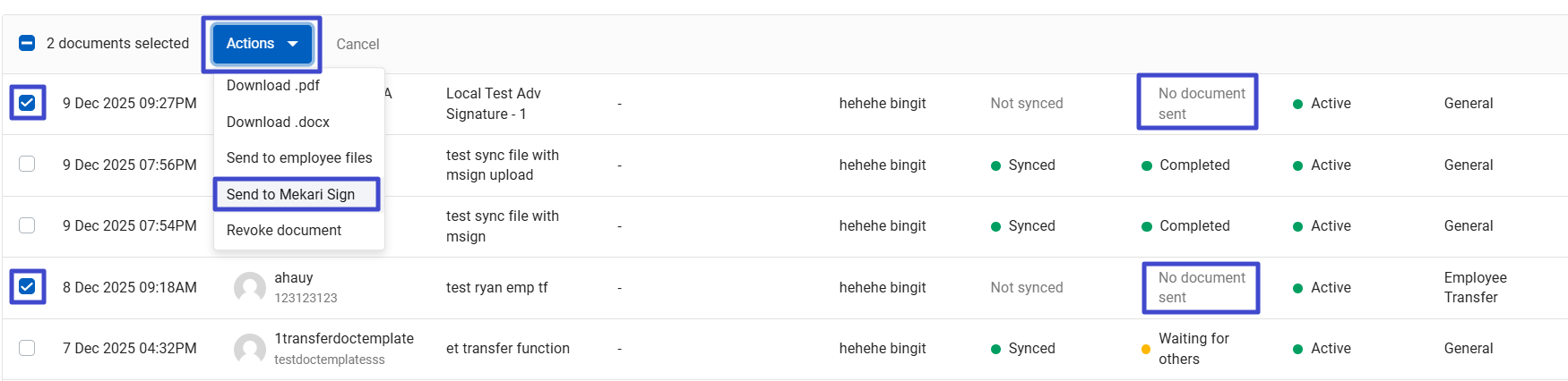 - In the Document section, you can click Better document resolution to view the document in better resolution. Additionally, you can check “Show QR code” to arrange the layout of the eMeterai QR signature in the document. In addition to sending documents to Mekari Sign (specifically for documents that have not been sent to Mekari Sign, integrated, and have the status "No document sent ") individually, you can also send them in bulk by checking the document names as follows. Then, click "Actions" and then click "Send to Mekari Sign."
