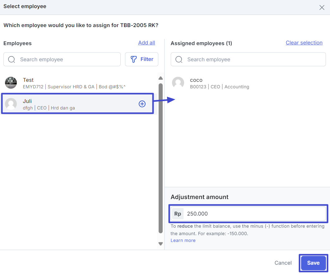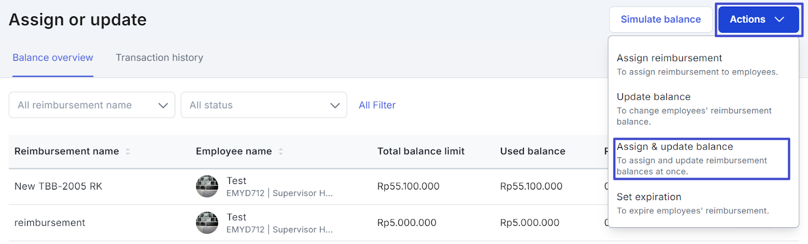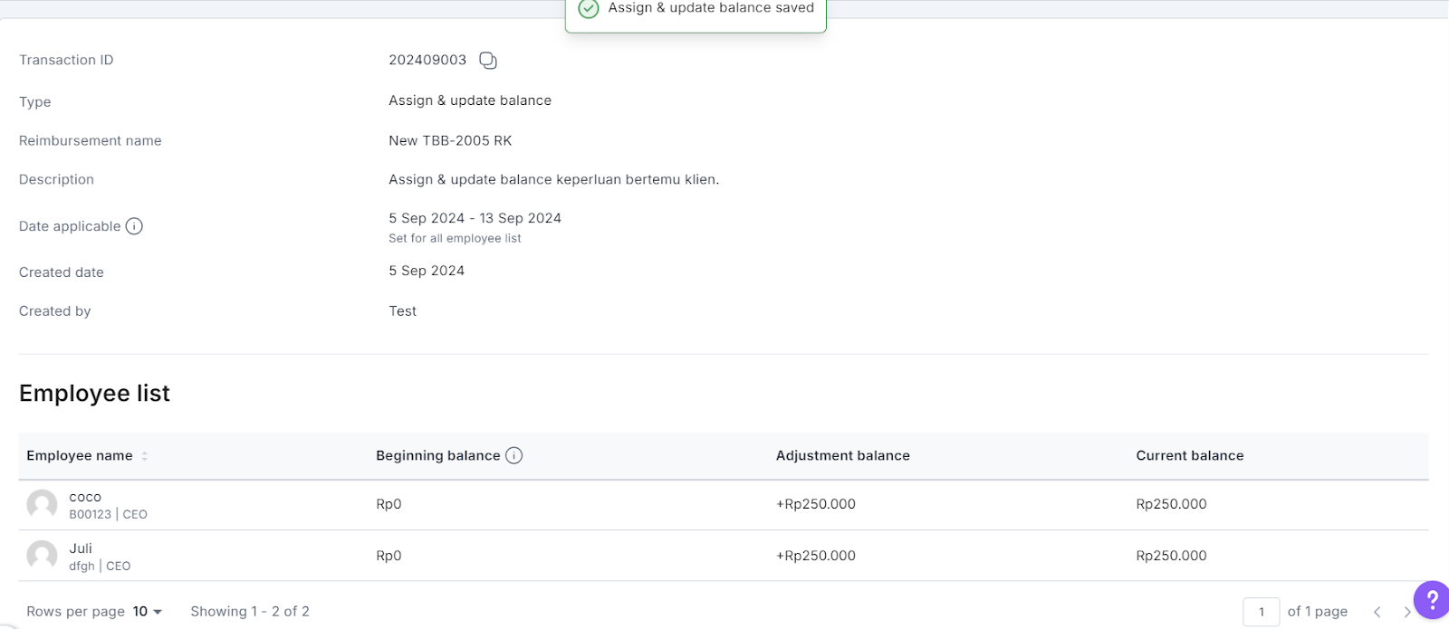 Superadmin and admin role holders on Talenta can Assign and update balances at once. Hence, you do not need to Assign or Update balance reimbursements one by one.