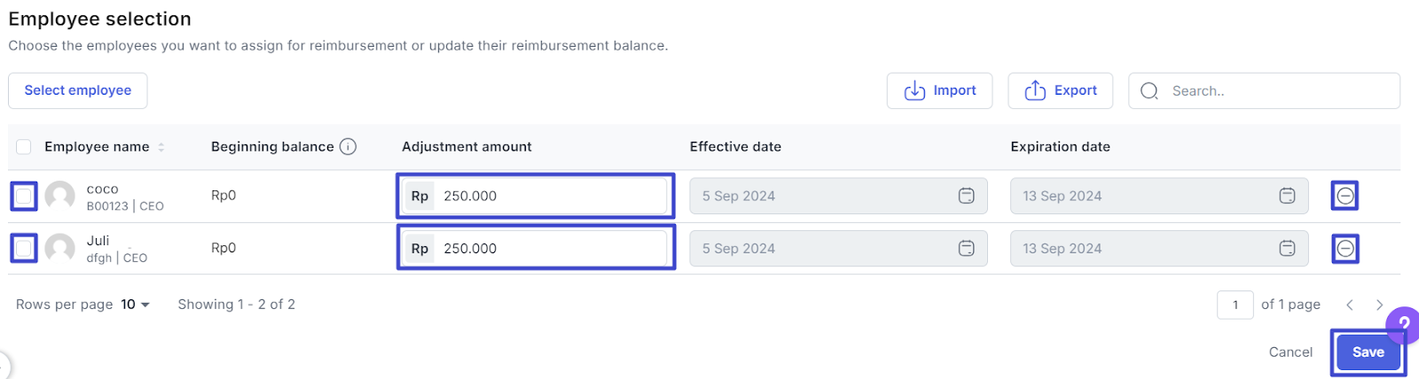 Then the employee name you selected will appear in the following list. In this section, you can still change the Adjustment amount. To delete a unit, you can click the “-” icon. Meanwhile, to delete names in bulk, you can click the checkbox on the left side of the employee name. Click “Save” to assign reimbursement to employees with the names listed.