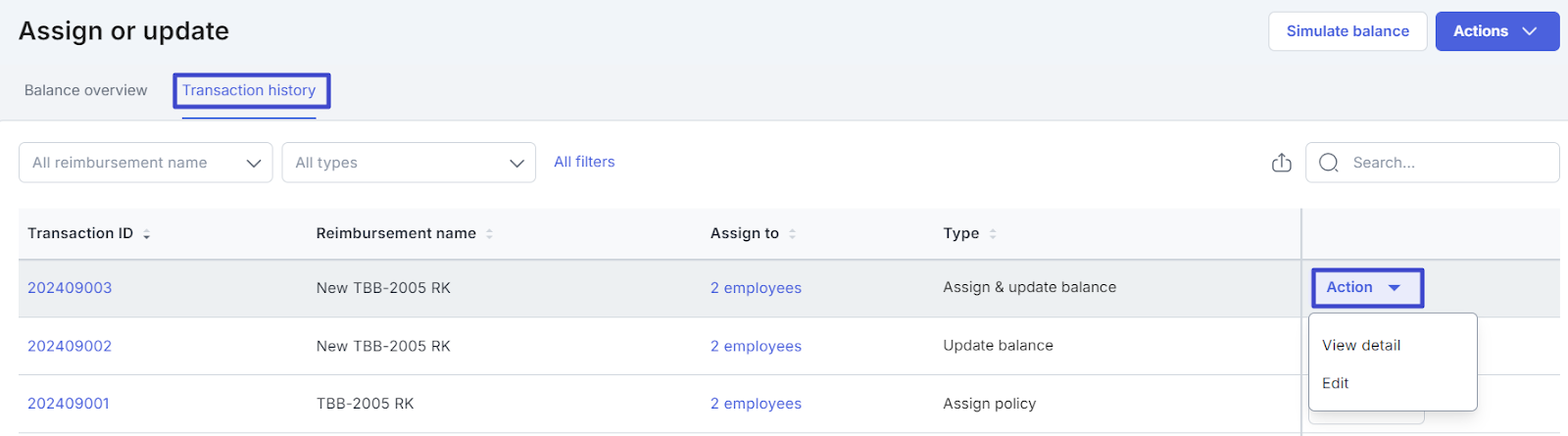 You can see the assigned & updated reimbursement actions on the Transaction History tab. Click “Action” to view the details (View detail) or to Edit.