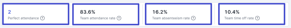 - Team absenteeism rate: Shows the percentage value of team absence. The intended absence is no clock in and clock out at the scheduled time.